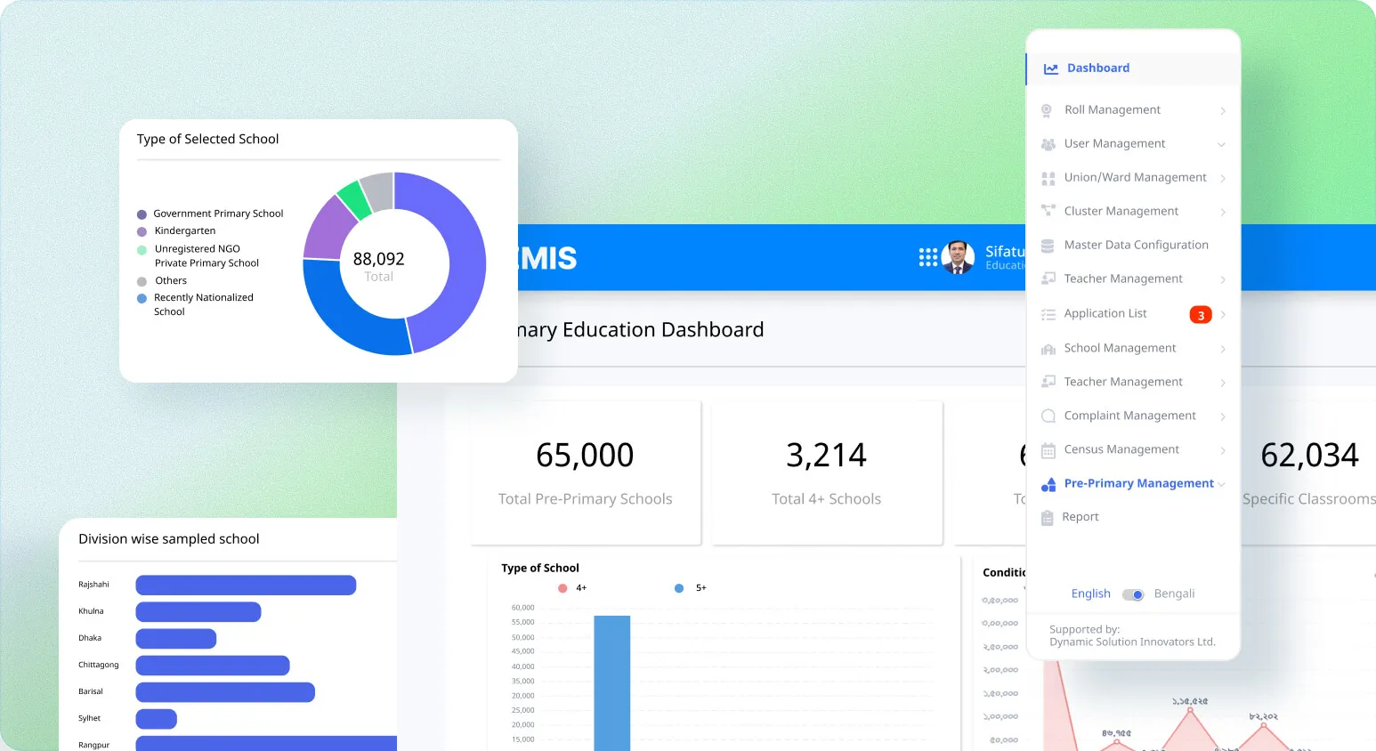 The Ministry of Primary and Mass Education needed a comprehensive digital platform that could handle teacher management, student enrollment tracking, school infrastructure monitoring, and resource allocation — all accessible from the national level down to individual schools.